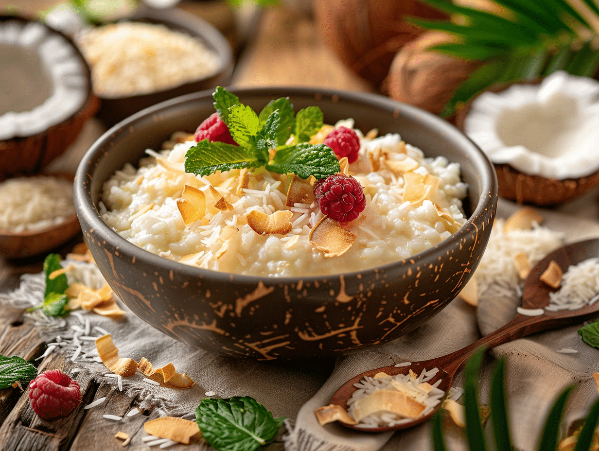 Pour sublimer votre riz au lait de coco, pensez à ajouter une gousse de vanille pour une note douce et raffinée. Le sucre muscovado peut remplacer le sucre blanc pour une saveur plus profonde et caramélisée. Parsemez de noix de coco râpée avant de servir pour une texture croquante.